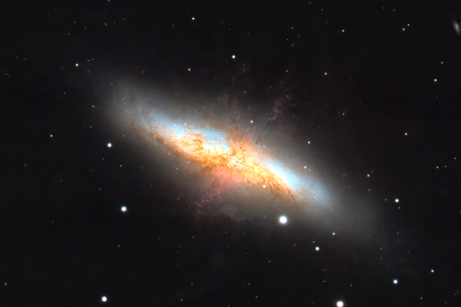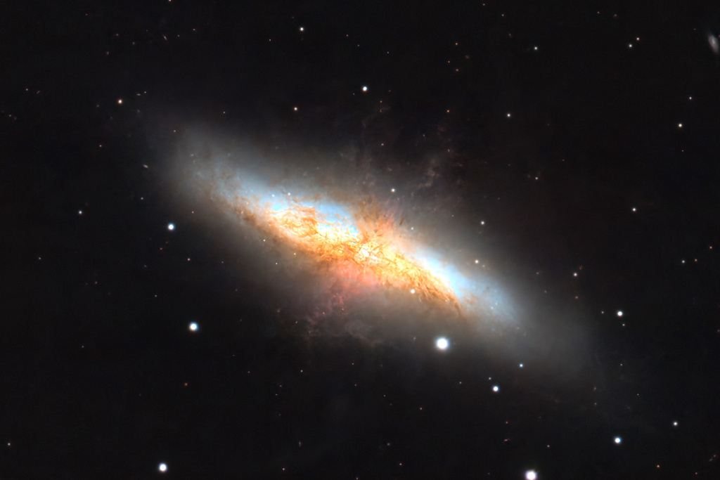 Der Eintrag Nummer 82 im Katalog von Charles Messier gilt der sogenannten „Zigarrengalaxie“ im Sternbild Großer Bär, rund 12 Millionen Lichtjahre von uns entfernt. Ihr gegenwärtiges Aussehen verdankt sie einer engen Begegnung mit dem Nachbarn, M81, vor einigen Millionen Jahren.