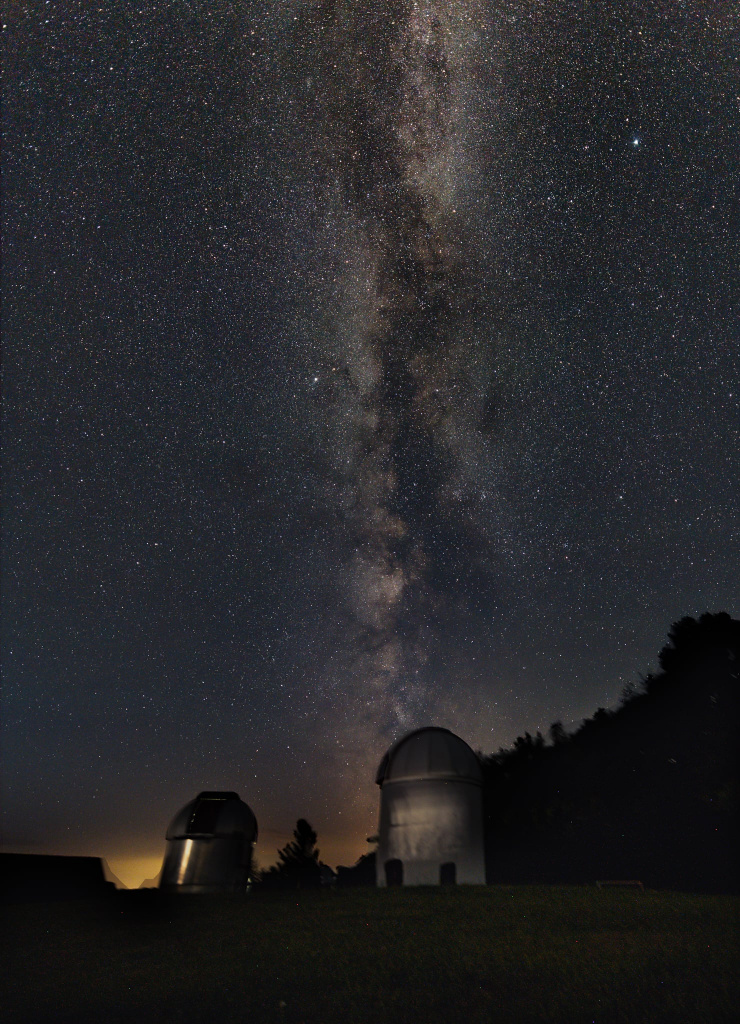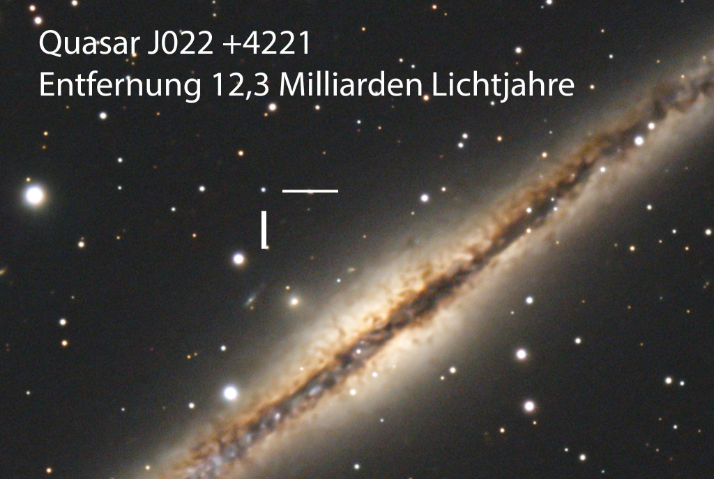 „Da ist eine lange dunkle Wolke mitten in der Milchstraße!“ Die Begeisterung über ihre erste Entdeckung war der Schülerin bei der Sternwartenführung anzumerken. Obwohl sie von einer ländlichen Volksschule kam hatte sie noch nie vorher mit eigenen Augen unsere Heimatgalaxie gesehen. Die dunkle Wolke in der Milchstraße besteht aus Gas und Staub, welche die Dahinterliegenden Sterne verdeckt. In diesen Staubwolken befinden sich die bunten Gasnebel. „Dort werden neue Sterne geboren“ sagte ich zu ihr. Wenn man nur aus unserer Milchstraße herausreisen könnte und sie von außen betrachten könnte! Dann würde sie vermutlich genauso aussehen wie die Galaxie NGC 891. 30 Millionen Lichtjahre entfernt im Sternbild Andromeda. Mit einem Durchmesser von 150.000 Lichtjahren gehört sie zu den größten Spiralgalaxien. Hier sieht man sehr schön das dunkle Band aus Gas- und Staub, der die Galaxie zerteilt. In der Mitte eine kleine Aufwölbung, das sogenannte Bulge, das Zentrum der Galaxie. Sehr interessant sind auch die kleinen Staubfäden, die oberhalb und unterhalb des Staubbandes von der Galaxie wegstreben. Vermutlich befördert hier der Strahlungsdruck von großen Sternen und Supernovae die Gas und Staubmassen aus der Galaxie heraus – und regnet dann wieder auf die Galaxie zurück. Ein Kreislauf, der neue Sterne schafft. Die Galaxie – ein lebender Organismus der Sterne bildet und zerstört. Aus der Asche werden wieder neue Sterne gebildet, ein riesiger Materiekreislauf dieser gewaltigen Sternenfabriken! Epilog: Einen Tag später kam ich darauf das auf dem Bild noch etwas Besonderes zu sehen ist. Ein Quasar, ein hell strahlender Kern einer Galaxie. Das Licht von ihr, das von einem supermassiven schwarzen Loch erzeugt wird war 12,3 Milliarden Jahre zu uns unterwegs………………..