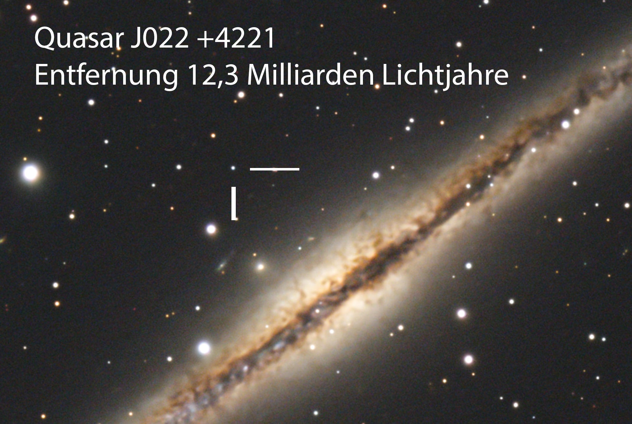 „Da ist eine lange dunkle Wolke mitten in der Milchstraße!“ Die Begeisterung über ihre erste Entdeckung war der Schülerin bei der Sternwartenführung anzumerken. Obwohl sie von einer ländlichen Volksschule kam hatte sie noch nie vorher mit eigenen Augen unsere Heimatgalaxie gesehen. Die dunkle Wolke in der Milchstraße besteht aus Gas und Staub, welche die Dahinterliegenden Sterne verdeckt. In diesen Staubwolken befinden sich die bunten Gasnebel. „Dort werden neue Sterne geboren“ sagte ich zu ihr. Wenn man nur aus unserer Milchstraße herausreisen könnte und sie von außen betrachten könnte! Dann würde sie vermutlich genauso aussehen wie die Galaxie NGC 891. 30 Millionen Lichtjahre entfernt im Sternbild Andromeda. Mit einem Durchmesser von 150.000 Lichtjahren gehört sie zu den größten Spiralgalaxien. Hier sieht man sehr schön das dunkle Band aus Gas- und Staub, der die Galaxie zerteilt. In der Mitte eine kleine Aufwölbung, das sogenannte Bulge, das Zentrum der Galaxie. Sehr interessant sind auch die kleinen Staubfäden, die oberhalb und unterhalb des Staubbandes von der Galaxie wegstreben. Vermutlich befördert hier der Strahlungsdruck von großen Sternen und Supernovae die Gas und Staubmassen aus der Galaxie heraus – und regnet dann wieder auf die Galaxie zurück. Ein Kreislauf, der neue Sterne schafft. Die Galaxie – ein lebender Organismus der Sterne bildet und zerstört. Aus der Asche werden wieder neue Sterne gebildet, ein riesiger Materiekreislauf dieser gewaltigen Sternenfabriken! Epilog: Einen Tag später kam ich darauf das auf dem Bild noch etwas Besonderes zu sehen ist. Ein Quasar, ein hell strahlender Kern einer Galaxie. Das Licht von ihr, das von einem supermassiven schwarzen Loch erzeugt wird war 12,3 Milliarden Jahre zu uns unterwegs………………..
