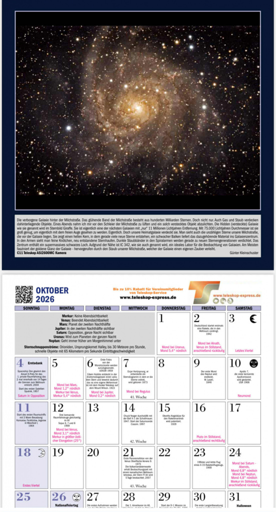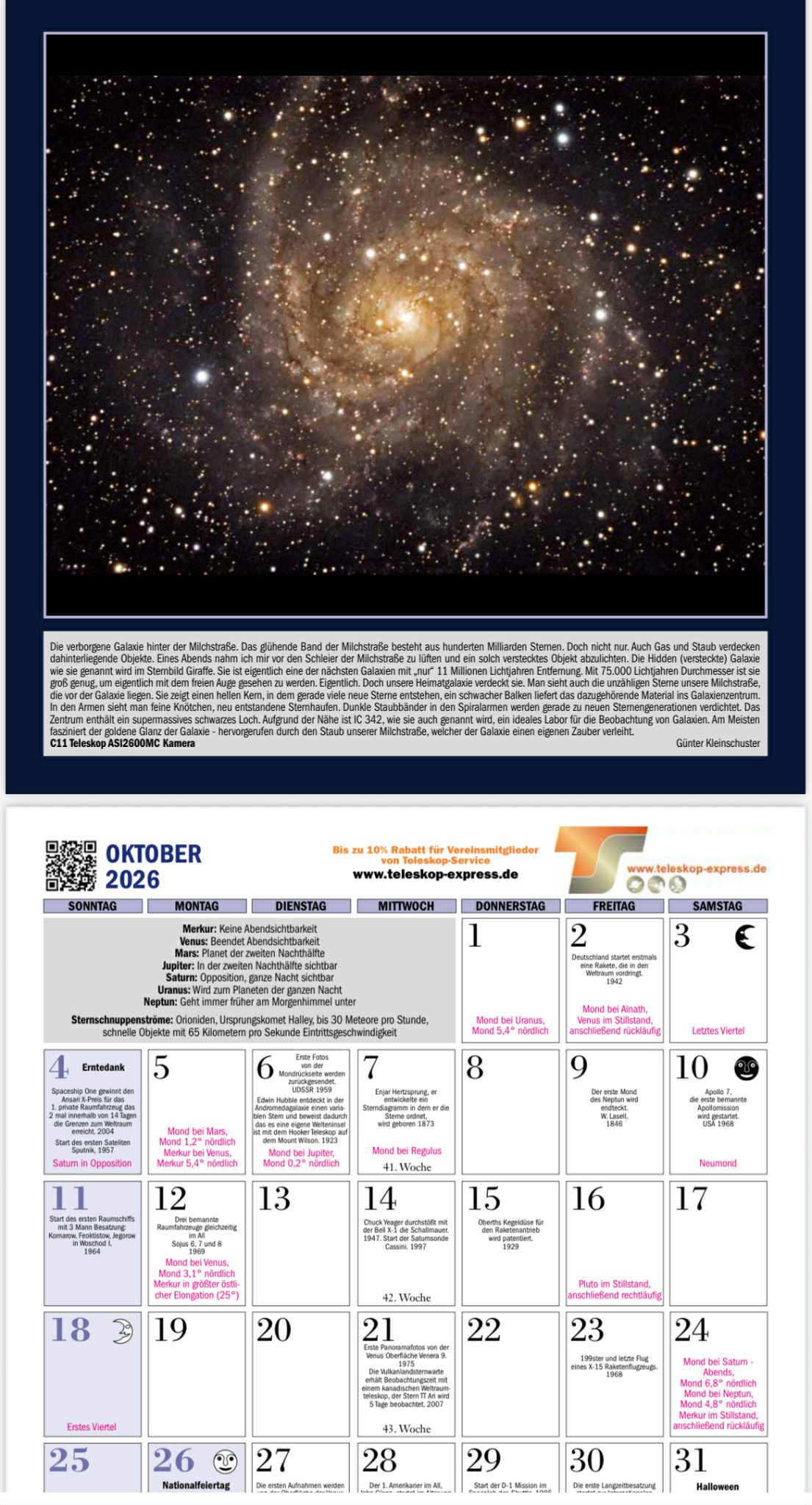 All diese Entwicklungen – und die zeitlose Faszination des Sternenhimmels – finden ihren Platz im neuen Astrokalender. Er ist weit mehr als ein Kalender: Er ist ein Begleiter durchs Jahr, voller bedeutender Jahrestage aus Astronomie und Raumfahrt, aktueller Tipps zu Planetensichtbarkeiten, Sternschnuppenströmen und seltenen Konstellationen am Himmel.