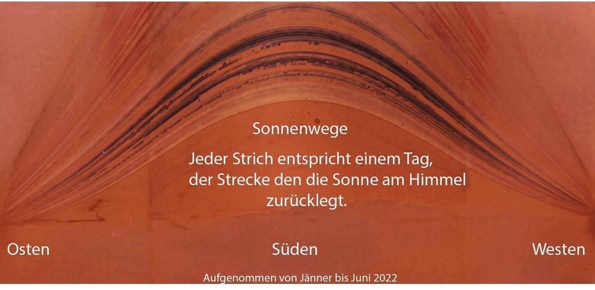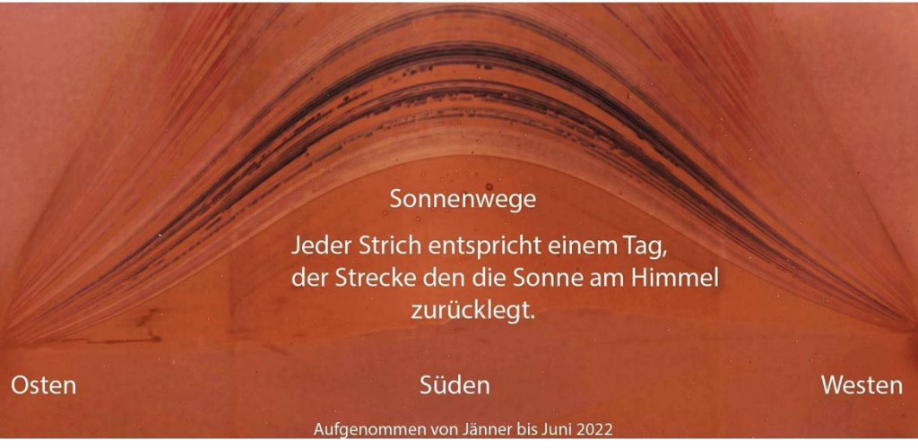 Sonntag. 21.Dezember. 16.03. Wintersonnenwende. Die Sonne steht in der niedrigsten Höhe über dem Horizont im Jahreslauf. Fotopapier genommen. In eine Aludose mit Loch gegeben. Ein Jahr draußen aufgehängt. Man sieht wie die Sonne immer niedriger über dem Horizont steht, bis zur Wintersonnenwende. Jeder Strich ist ein Tag, gezeichnet von der Sonne