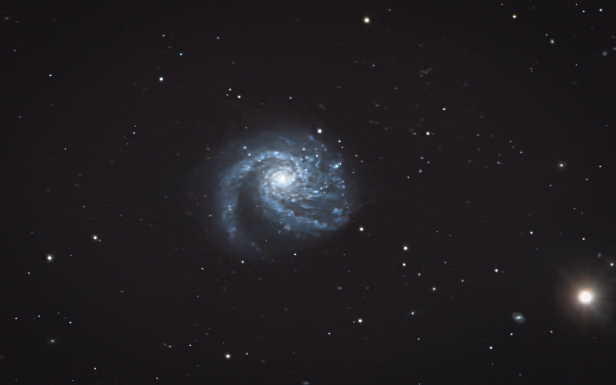 Die Galaxie entfernt sich mit 2.704 Kilometern von uns. Pro Sekunde. Die höchste Geschwindigkeit mit der sich ein Messier Objekt von uns entfernt. Ihre Entfernung liegt damit bei 55 Millionen Lichtjahre