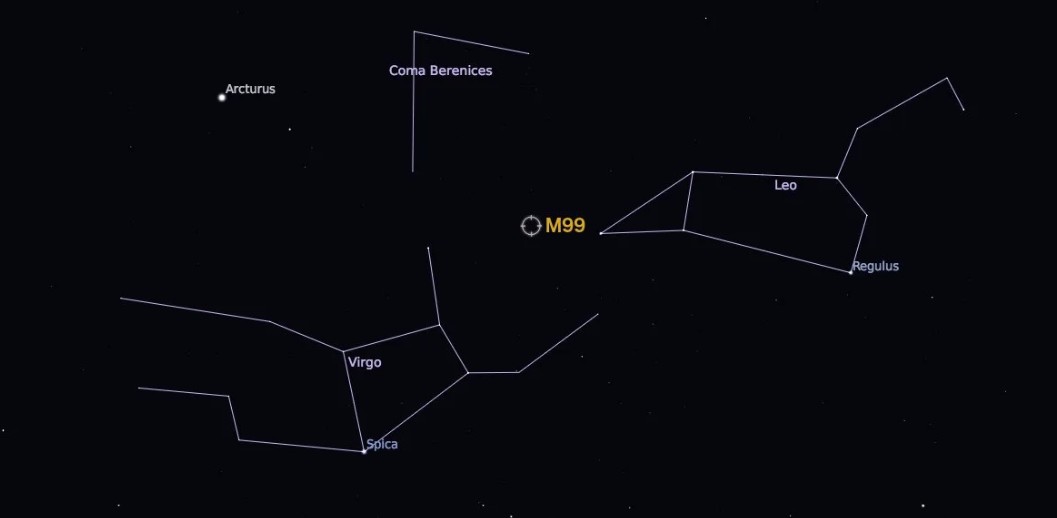 Schneckenhäuser. Hurrikans. Sonnenblumen. Die Natur liebt die Spiralform. In allen Größenordnungen. Bis zu den 100.000 Lichtjahren großen Spiralgalaxien. Die zweite je entdeckte Spiralform wurde bei Messier 99 festgestellt. The dritte Earl von Parsons hat sie im Jahr mit dem damals größten Teleskop, einem Meter Fernrohr auf seinem Anwesen in Irland im Jahr 1846 entdeckt, nach der berühmten Whirlpoolgalaxie Messier 51. Er schreibt über seine Entdeckung: „Spirale mit einem hellen Stern darüber; ein dünner Teil des Nebels reicht über diesen Stern hinaus. Die Hauptspirale liegt unten und ist rechtsdrehend.“