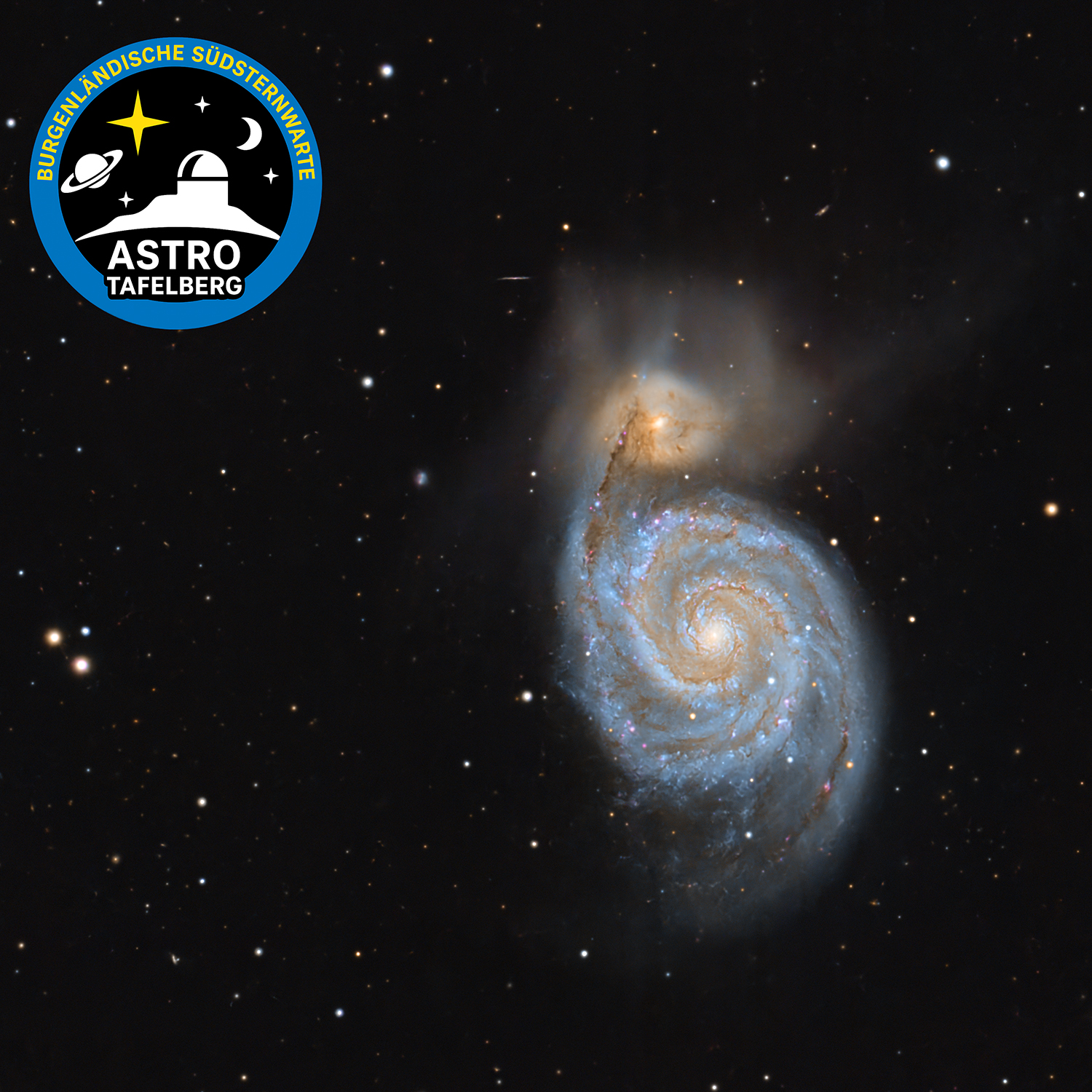 M51, auch Whirlpool oder Strudelgalaxie genannt, ist eine Spiralgalaxie, rund 24 Millionen Lichtjahre entfernt, im Sternbild Jagdhunde. Sie interagiert heftig mit ihrem nördlichen Nachbarn, der kleinen Galaxie NGC 5195, was zu einem regen Austausch von Gas und Staub führt, wie in diesem Bild besonders detailreich zu sehen.