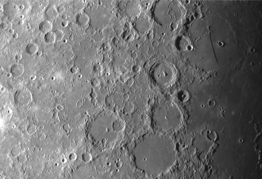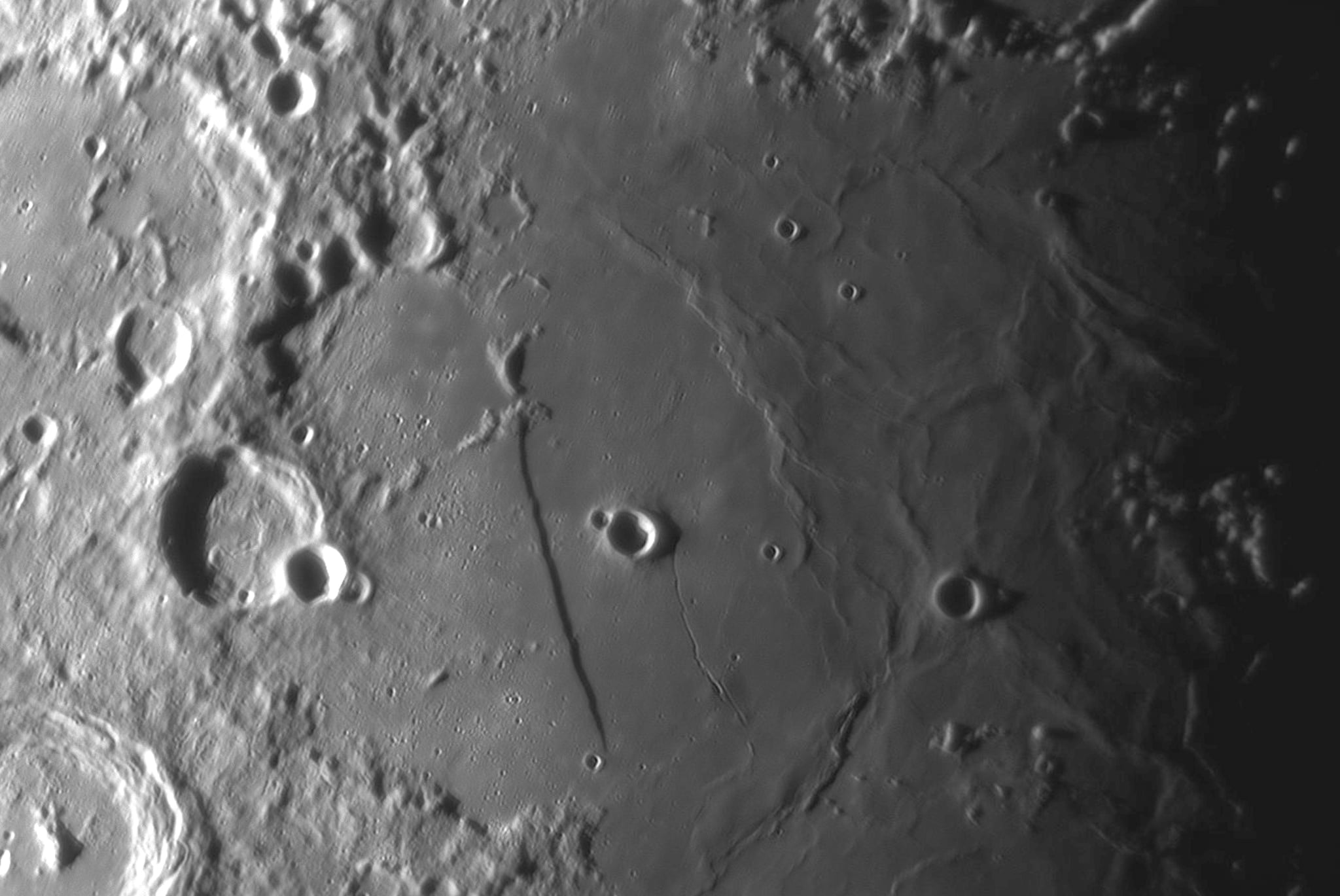 Die große chinesische Mauer ist vom Weltraum aus von Astronauten zu sehen. Diese Aussage wird oft verbreitet, stimmt aber nicht. Obwohl sie mit 6.620 Kilometer das längste Bauwerk der Welt ist gelingt es nicht sie von der internationalen Raumstation aus zu beobachten. Die Astronauten berichten aber das sie die Grenze von Süd- zu Nordkorea leicht erkennen können. Allerdings in der Nacht, während Südkorea hell erleuchtet ist herrscht in Nordkorea Dunkelheit. Eine „Mauer“ die aber von der Erde aus auf dem Mond zu erkennen ist ist Rupes Recta. Auch als lange Wand bezeichnet befindet sie sich im Mare Nubium (dem Wolkenmeer). Die Stufe hat einen Höhenunterschied von bis zu 500 Meter, ist 3 Kilometer breit – aber 116 Kilometer lang. Wenn der Mondschatten in seiner monatlichen Wanderung über unseren Trabanten streift ist die lange Wand in der Nähe der Schattengrenze schon in kleinen Teleskopen zu sehen. Würde man vor der langen Wand in seinem Raumanzug stehen sieht man einen Steilhang mit 30 Grad Neigung und 500 Metern Höhe! Er würde sich bis zu beiden Seiten des Horizonts ziehen und dann dahinter verschwinden. Ein imposanter Anblick! Solche Steilhänge entstehen als Reste von Kratergebirgen oder eher hier wahrscheinlich als Bodenabsenkung infolge des Mare Imbriums Einschlages. Zwei große Krater sind zu sehen. Links Krater Thebit mit 55 Kilometern Durchmesser liegt er am Rande des Wolkenmeers.Rechts von der langen liegt mit 16 Kilometern der Krater Bird. Doch noch eine Besonderheit sieht man in diesem Bild. Links und rechts der langen Wand sieht man sanfte Hügel. Mit Birt dome und Thebit domes gibt es hier seltene Erscheinungen der vulkanischen Aktivität auf dem Mond. Domes sind nichts anderes als die auf der Erde vorkommenden Schildvulkane. Und so zeigt unser dieser kleine Bildauschnitt die gewaltigen Kräfte die planetare Körper bildeten – Rillen aus epischen Einschlägen und Vulkanausbrüche, die Welten formten.