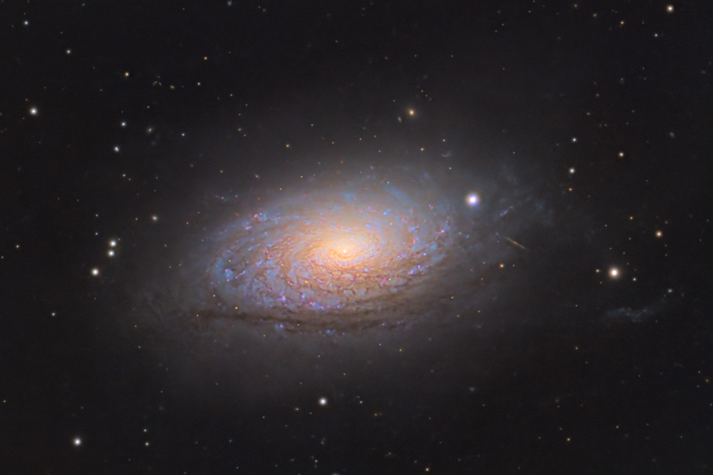 Messier 63 oder auch „Sunflower-Galaxy“ genannt ob ihrer Struktur, ist eine Spiralgalaxie im Sternbild Jagdhunde – gut 25 Millionen Lichtjahre von uns entfernt und von halber Größe in Relation zu unserer Milchstraße. In dieser langbelichteten Aufnahme kann auch sehr schön der Sternstrom rund um die Galaxie erkannt werden, der vermutlich vor 100 Millionen Jahren beim „Verschlucken“ einer Zwerggalaxie entstanden ist.