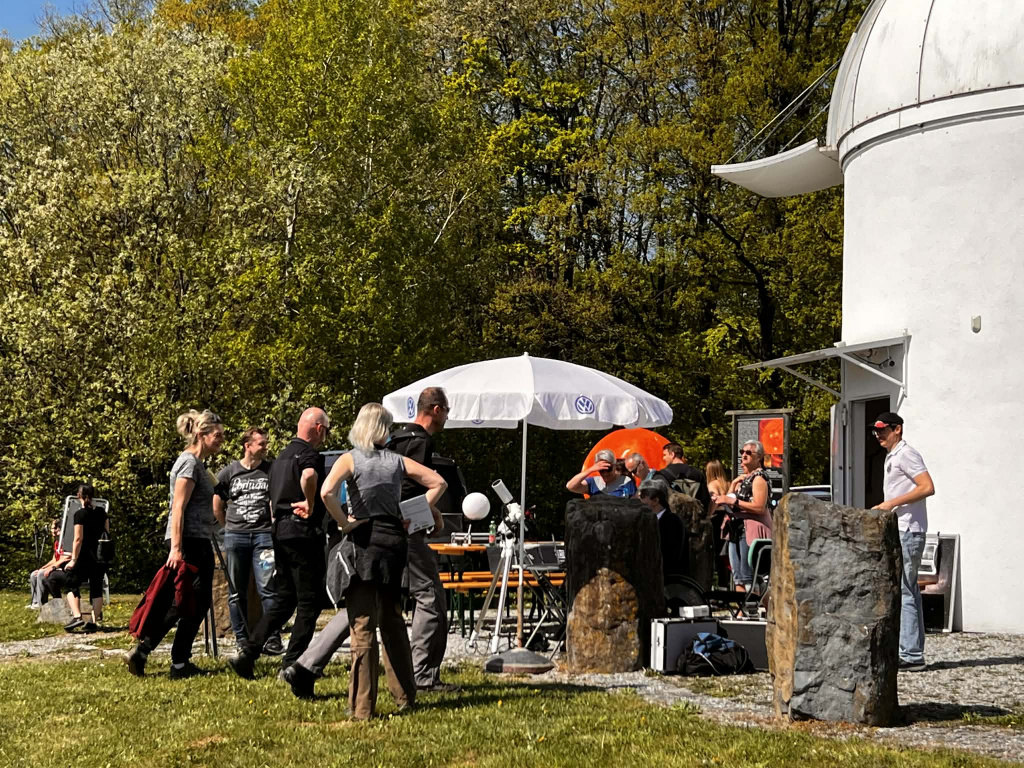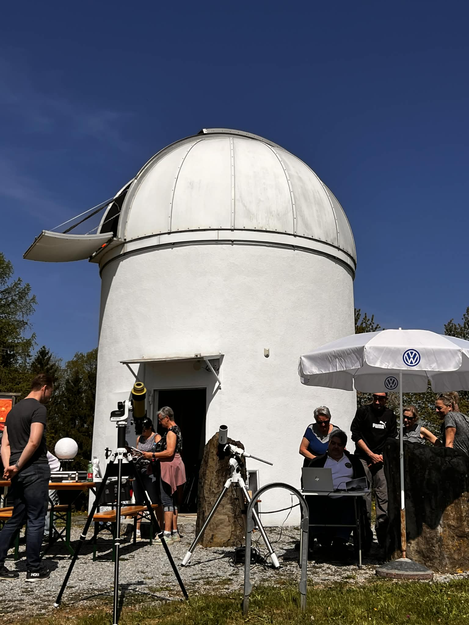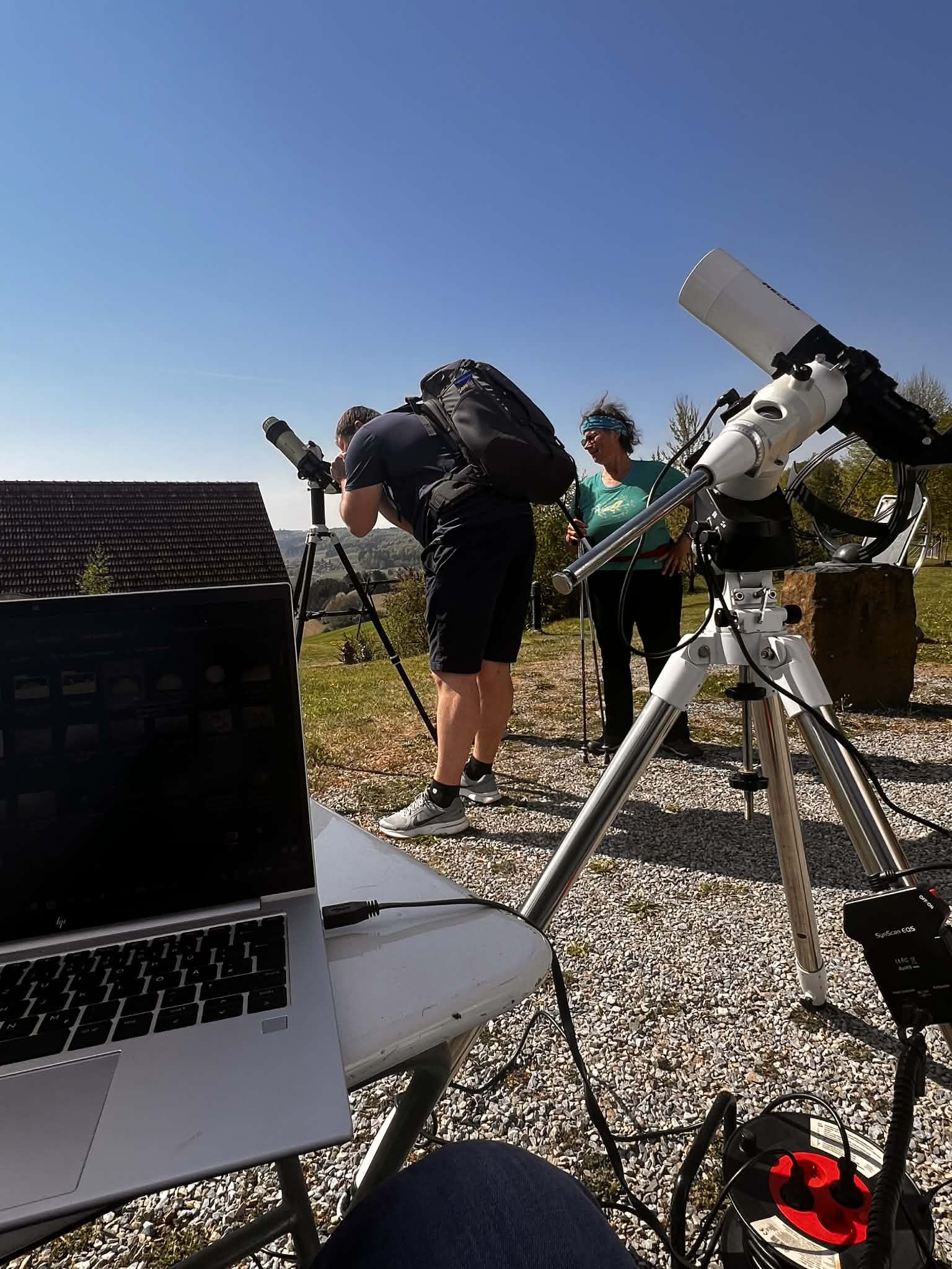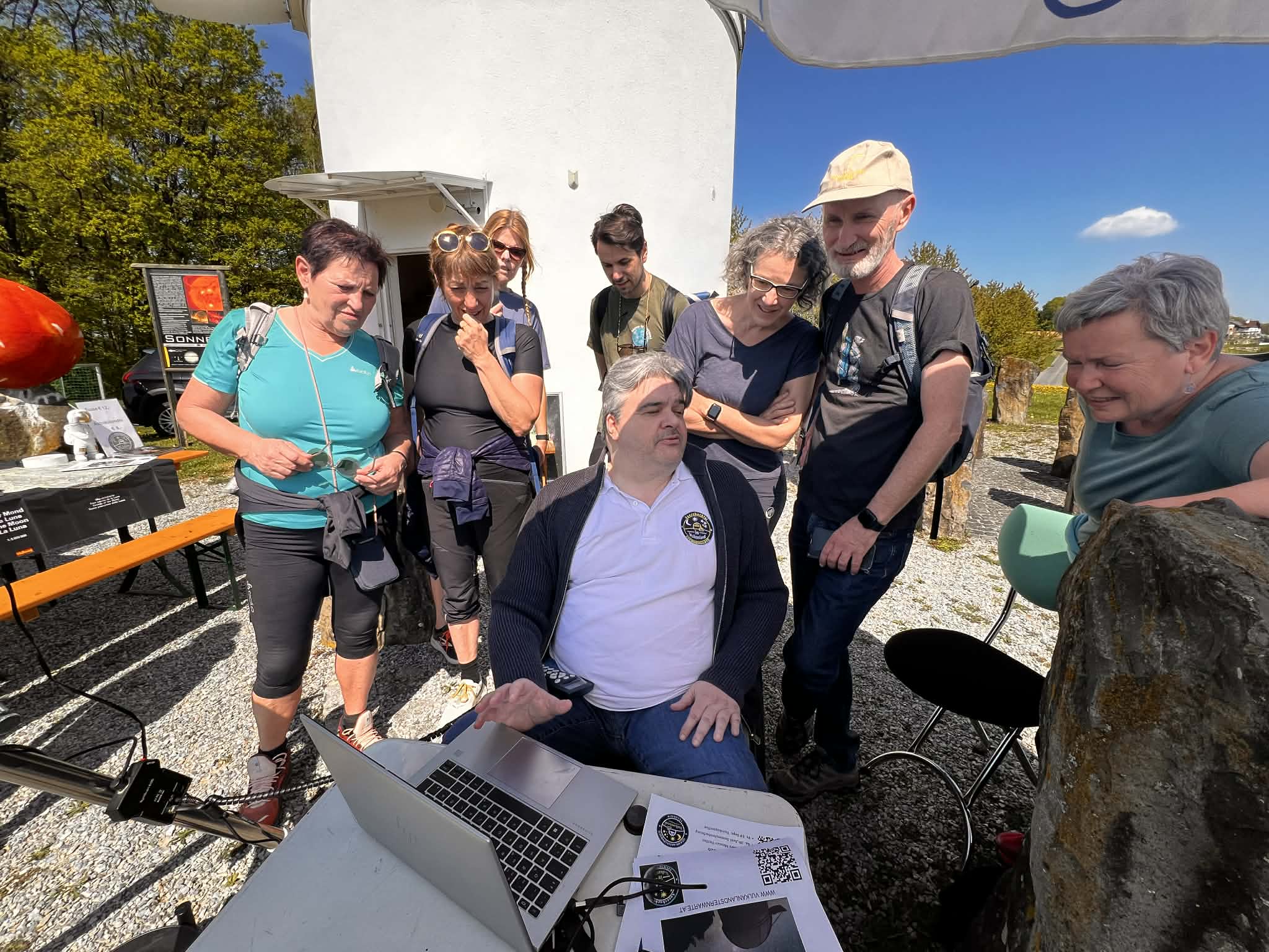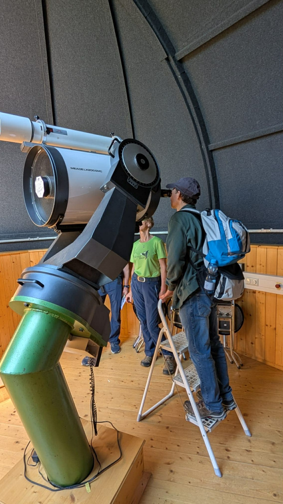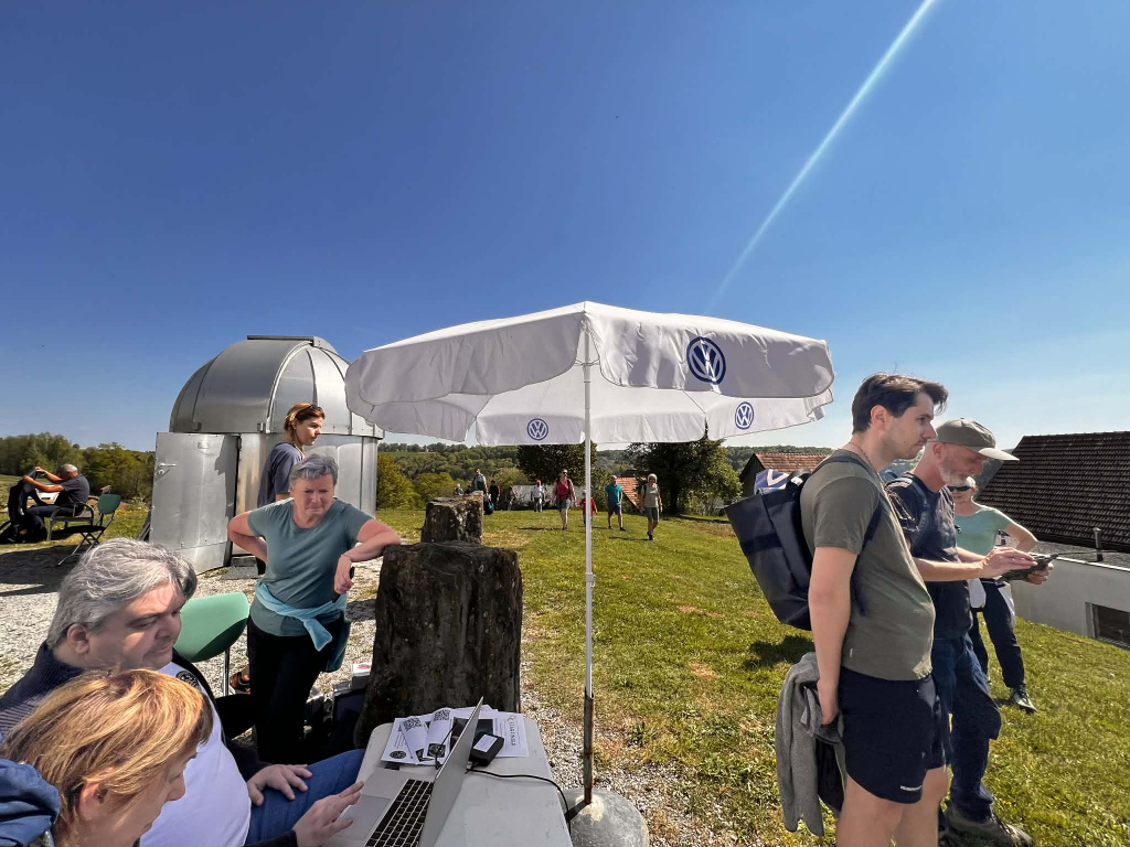 Wir hatten von 9.30 bis 14.00 dauernd Besucher. Wir hatten zu viert ganz schön zu tun, um alle Fragen der Gipfelstürmer zu beantworten. Wir präsentierten die Sonne mit 3 Teleskopen, erklärten die Funktionsweise der Fernrohre und sprachen über unsere Abendführungen. Es gab sogar einen Raketenstart!